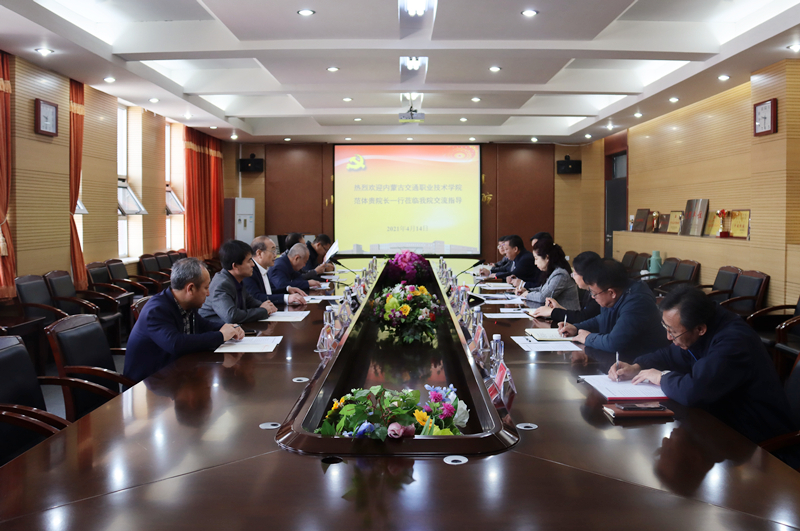 2021年4月14日上午,內(nèi)蒙古交通職業(yè)技術(shù)學(xué)院院長范體貴、副院長鄭廣軍帶領(lǐng)黨政辦公室、教務(wù)處、招生工作處、教學(xué)培訓(xùn)實習(xí)部等部門負(fù)責(zé)人來我院考察交流。學(xué)院黨委書記孫智憑會見了范體貴院長一行。學(xué)院黨委副書記、院長白托婭,副院長孫恒及相關(guān)職能部門負(fù)責(zé)人與范體貴院長一行在A439會議室進行了座談交流。